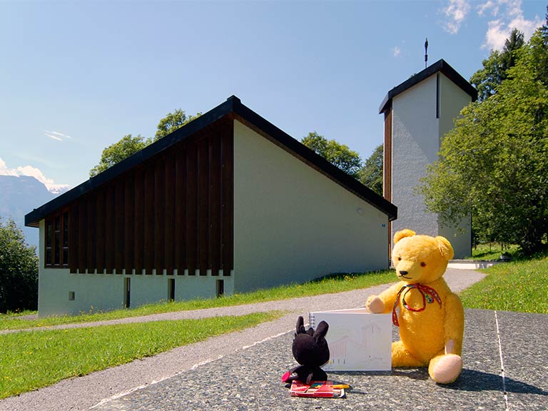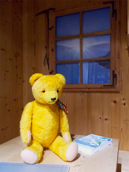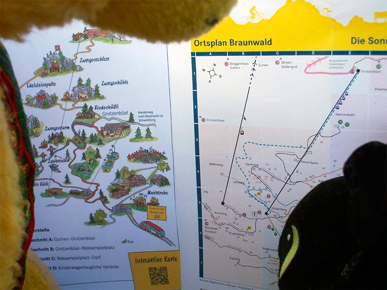 Der kleine Flatterer und ich machen uns für die Reise ins Glarnerland bereit. Wir werden mit dem grossen elektrischen Bärentransporter fahren und danach eine kleine Ausgabe davon benutzen, um nach Braunwald zu kommen. Es hat viele Menschen in der Kabine, aber keine anderen Bären. Der Name ‹Braunwald› weist auf dicht besiedeltes und bewaldetes Gebiet, und es gibt eine erste schriftliche Erwähnung 1421. Die Ortschaft ist autofrei, es gibt landwirtschaftliche Fahrzeuge und Baumaschinen, und ein Pferdetaxi.