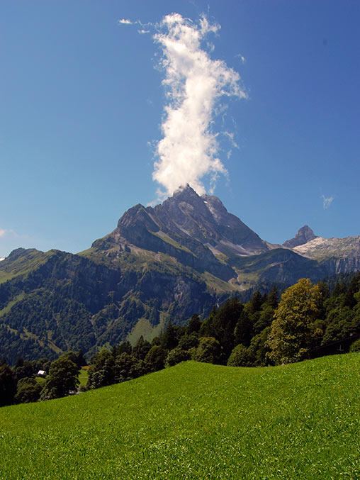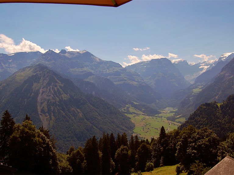 Das ist die Aussicht von der Terasse des Hotels mit Blick auf die Glarner Alpen, den Tödi und ‹Tierfehd› unten im Tal.