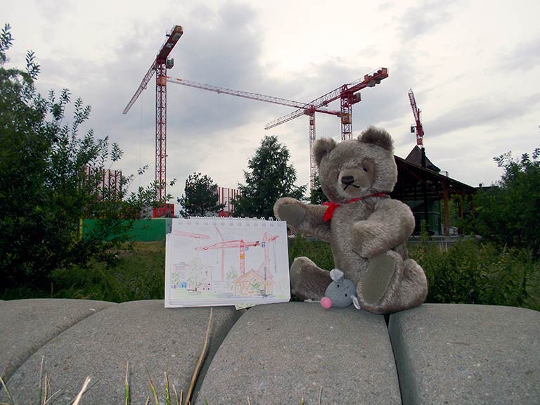 Wir starten wieder in Schlieren, der Mensch ist ein bisschen unschlüssig wo er hinmöchte, sieht dann aber Kräne und meint, das könnten wir uns mal näher anschauen. Alles schön neu hier. Und wir haben Farbstifte mit Papier dabei, so können wir wieder eine kleine Zeichnung machen. Nicht schlecht. Hinter der Mauer, auf der Célestine und ich sitzen, hat es eine kleine Wiese, die Menschen nennen es wahrscheinlich ‹Biotop›. In den Spalten der Mauer wohnen Eidechsen.