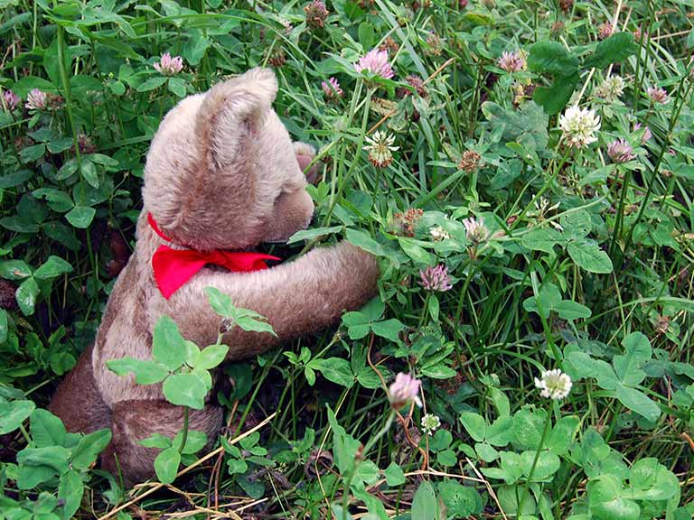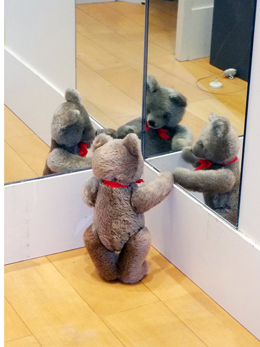 Hübsch, nicht? Ich, vierfach. Viermal Matthieu Steiff. Wir sehen von jeder Seite gut aus. Brauchen auch keine Textilien wie die Menschen. Wir haben ein Fell und gut ist. Na ja, vielleicht noch eine kleidsame Schleife, soviel muss sein. Rot, wie es sich bei Steiff gehört.