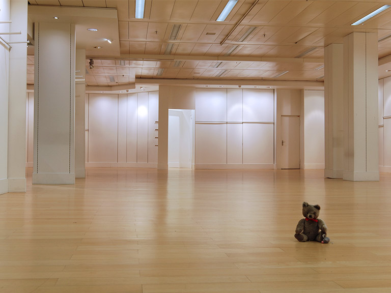 Der ganze obere Stock ist leergeräumt. Hier waren mal Kleider. Zur Strasse hin hat es keine Fenster, damit die Gestelle an den Wänden aufgestellt werden konnten. Unten hat es Fenster, damit die Leute hineinsehen konnten.