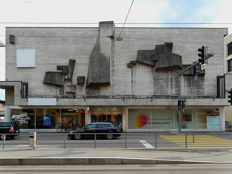 Dietikon. Stadt im Limmattal, mit einer berühmten Fassade aus Beton. Schön? Der Mensch runzelt die Stirne. Innen ist leer, oder fast leer.