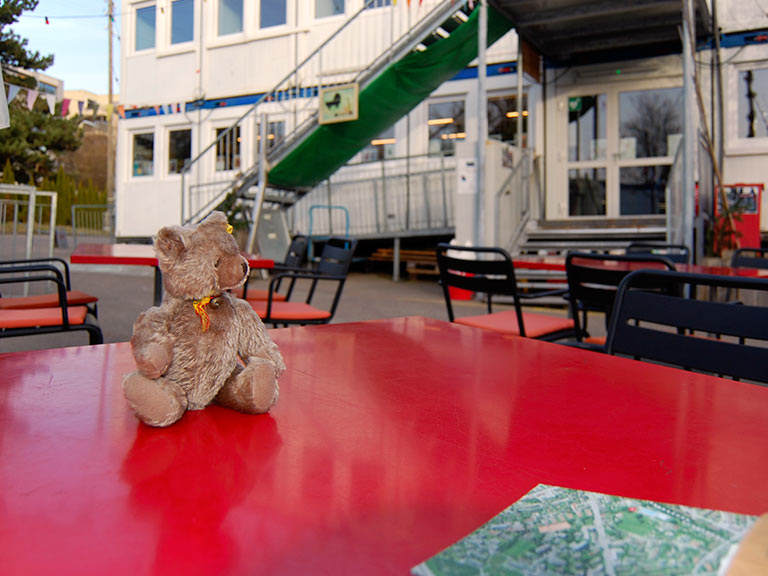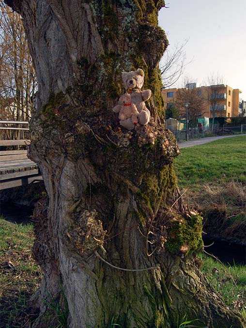Am Chatzenbach hat es ein paar schöne Bäume, auf die gut geklettert werden kann. Der kleine Bär aus Winterthur hat sich irgendwie in die Tasche geschmuggelt und ist jetzt eben auch dabei.