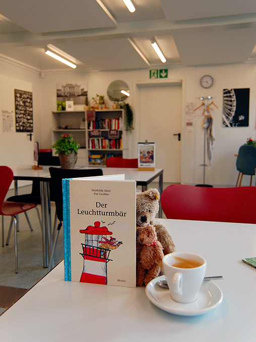 Der Mensch braucht eine Tasse Brühe, und da wir an einem Büchergestell vorbeikommen, wird auch dort hineingegriffen. Wir nehmen uns den ‹Leuchtturmbär› vor. Das Provisorium steht noch eine Weile, von aussen sind es Container, das Titelbild zeigt die GZ von aussen.