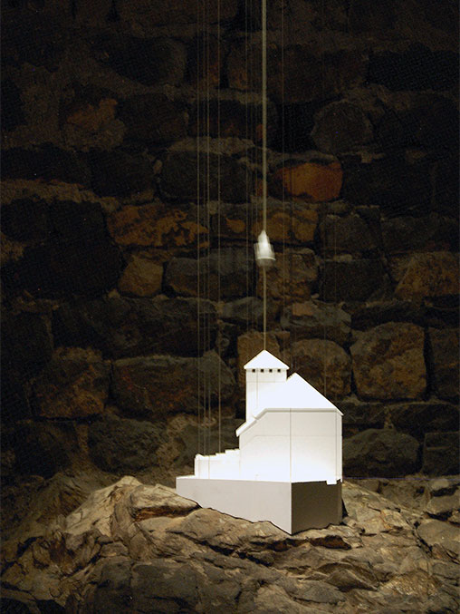 Im Turm gibt es ein Modell des Schlosses, bei dem die einzelnen Teile von oben an Drähten herunterkommen. Hier wird die Kuppel aufgesetzt.