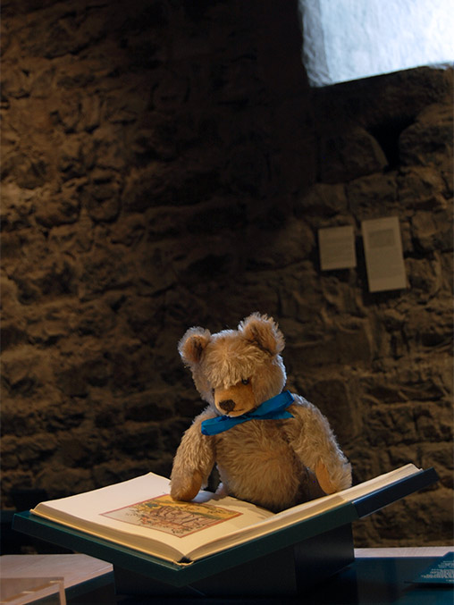 Wir liessen uns vom Menschen zum Schloss hochtragen. Hier wohnte man herrschaftlich, und wir fanden im Turm ein Schachspiel. Dieses Spiel besteht aus 16 weissen und 16 schwarzen Figuren auf 32 weissen und 32 schwarzen Feldern. Schwarzer Bär auf schwarzes Feld, weisser Bär auf weisses Feld. Ganz einfach. Die Steiff’sche Eröffnung gewinnt immer. Wir spielen hier in den Gemächern der letzten Schlossherrin.