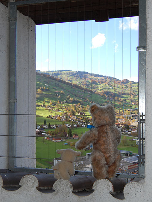 Nun sind wir ganz oben im Turm, die Fensteröffnungen haben Drähte, damit nichts reinfällt. Wir schauen auf Unser Untertanenland. Gams, Grabs, Oberriet, Altstätten; das Rheintal.