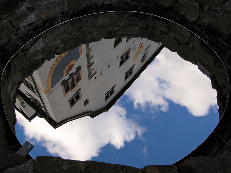 Spieglein Spieglein – das Schloss spiegelt sich in der Abdeckung des Sodbrunnens im Hof.
