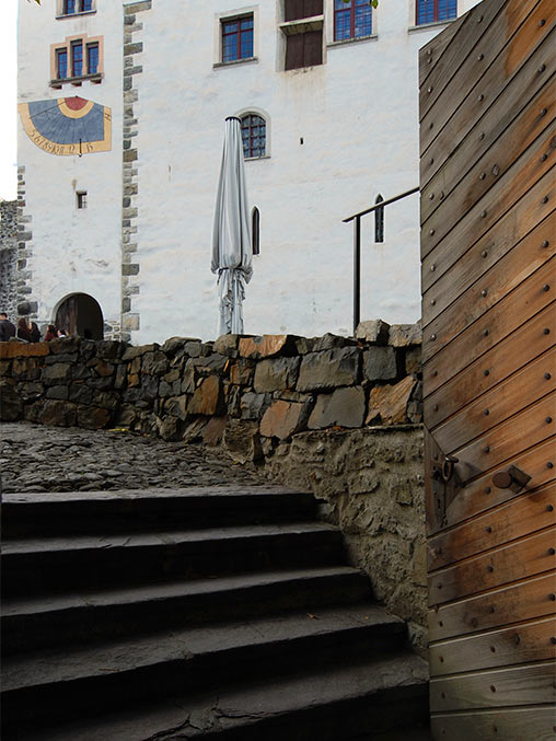Wir verabschieden uns vom Schloss. Unter dem Tor zum Turm versammeln sich die Gäste der letzten Hochzeit der Saison.