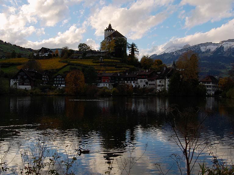 Schloss und Städtchen bilden eine schöne Kulisse vor dem herbstlichen Abendhimmel. Wir beenden den Besuch bei unseren Untertanen. Der Mensch verpasst den gelben Bärentransporter und muss zu Fuss zum Bahnhof. Wir werden ordentlich durchgeschaukelt in der engen Tasche.