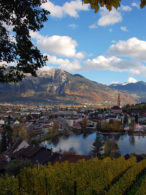 Wir blicken über einen Rebberg und den kleinen See auf eine rosa Kirche und die Ortschaft Buchs SG (es gibt noch mehr ‹Buchs› in der Schweiz).
