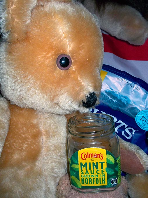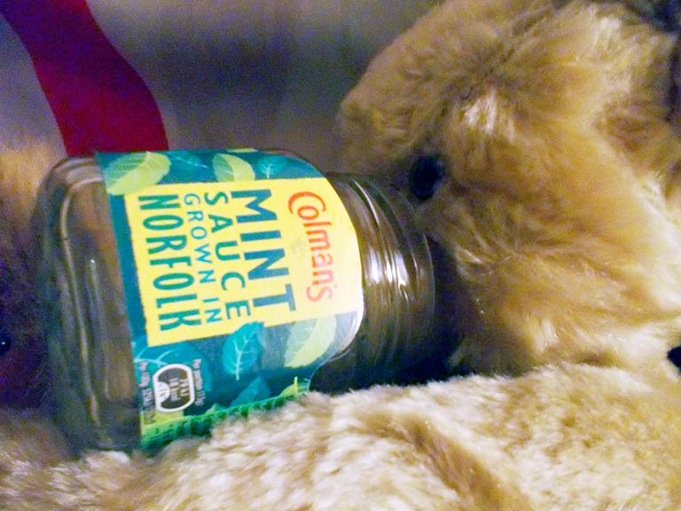 Percy nimmt zu sich eine kleine Stärkung und eintaucht tief in das Glas mit Mint Sauce. Sehr tief.